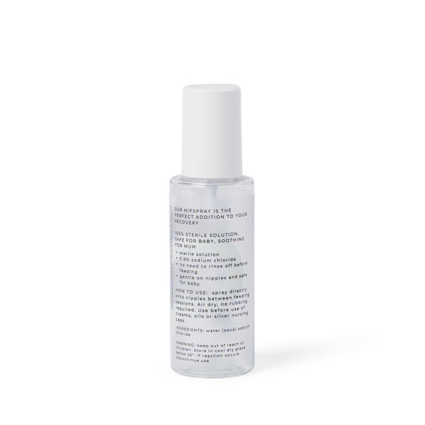 Saltwater remedies have been around for centuries and are well known for their healing properties. Nipspray is easy and convenient, so you can soothe your sore nips in between feeding and when on the move. There's no need to rinse off before feeding; Nipspray is sterile. It's also gentle on nipples and 100% safe for baby as well.