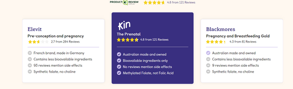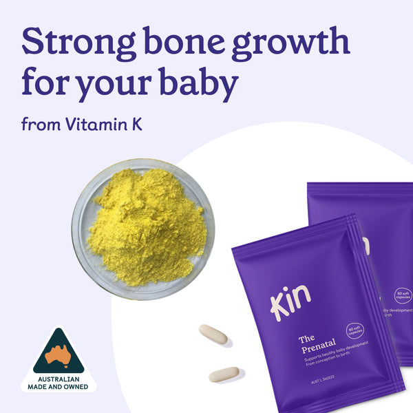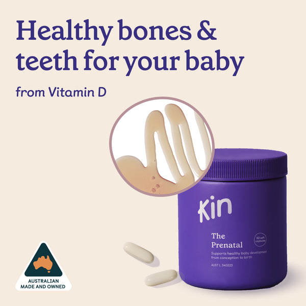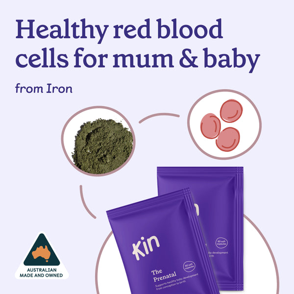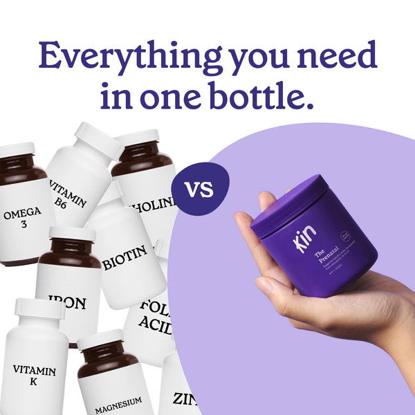 Unlike traditional pregnancy vitamins, Kin's Prenatal includes low-constipation iron for blood health, omega-3 for brain growth, and choline for brain function.