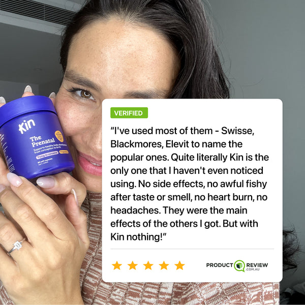 This unpleasant side effect is caused by poorly processed, low-quality fish oils. The Kin Prenatal only uses a high quality, concentrated type of fish oil with a standardised quantity of DHA and EPA, and low mercury levels.