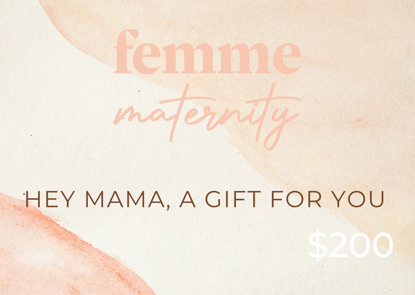 A Femme Maternity store digital e-Gift Card is the perfect way to give that special mama or mama-to-be some love and appreciation. The perfect way to say that I see you and that you also deserve some care during this transformative time. It's the heart of what we stand for here at Femme.